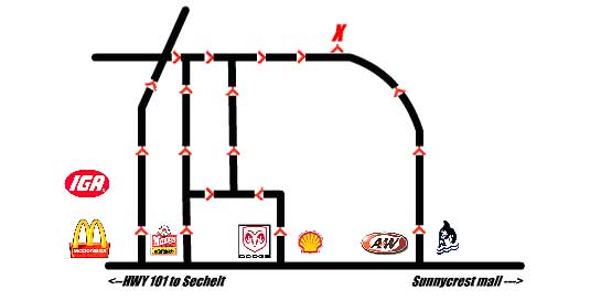 Upper Gibsons - Venture Way, turn at the blackfist and go up around the bend.